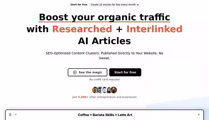 Machined is an AI-powered SEO platform built primarily around content clusters and topical authority. Rather than generating one article at a time Machined creates entire content clusters, a group of internally linked articles structured around a core topic. You define your topic, and the platform researches keywords, builds clusters, generates content, and handles internal linking automatically. It’s designed for businesses and marketers who want to scale organic traffic through topical depth rather than individual one-off posts. The platform supports multiple content types and lets you customize structure, tone, and output quality to match your brand.