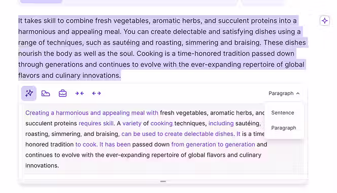 - Sentence-level adjustments without rewriting the whole document. Highlight any phrase and see multiple alternatives without disrupting surrounding text.