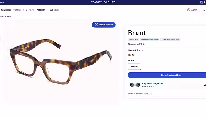 Clean spec details, try-at-home messaging, and trust signals near the CTA; a staple example in ecommerce inspiration guides.
