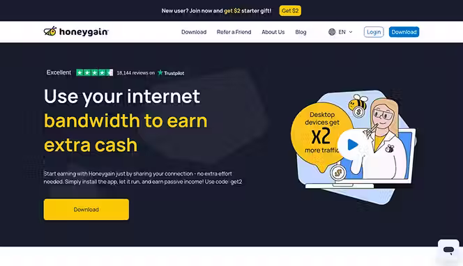 Honeygain is a passive income app that pays users for sharing their unused internet bandwidth. The platform works by tapping into your internet connection and selling access to it for data intelligence tasks like web crawling and content delivery. Think of it as renting out your bandwidth instead of letting it sit unused.