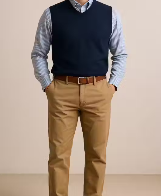 A blazer instantly elevates business casual for men. You don't need to wear it every day, but having one on hand transforms your look. Navy, gray, or charcoal blazers are versatile and work with most outfits. A sweater vest or cardigan also works as a layering piece to add sophistication.