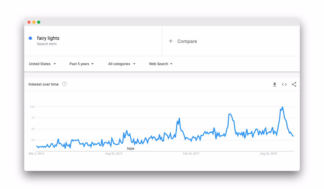 Google Trends confirme notre affirmation et convient que s'approvisionner en guirlandes lumineuses d'ici septembre est une excellente stratégie :
